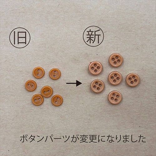 使用しているプラスチックボタンパーツ2つ穴が廃盤により4つ穴デザインに変更になりました。こげ茶系からブラック系に変更になりました。