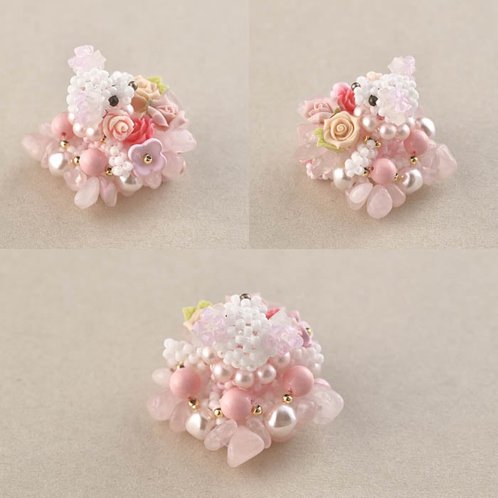 | 使用パーツ | 丸小、バロックパール、アクリル丸玉、セラミックフラワー、ソフトフラワー、アクリル4弁花、サンコバラ(さざれ石)、ローズクォーツ、ローズクォーツ星型、クリスタル |