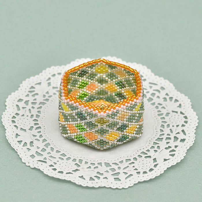 BOXの形は6角形。ペヨーテステッチで立体のBOXを編みます。