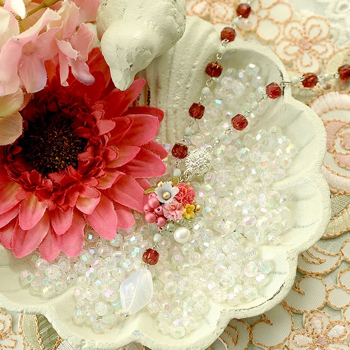 鮮やかなピンクのカーネションやカラフルな小花と樹脂パールでまとめたモチーフを、チェコビーズで繋げて首のラインが綺麗に見えるY字ネックレスに。