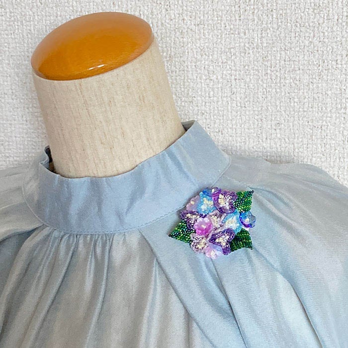 | 商品説明 | 季節を彩るBOXシリーズのあじさいの花を、鬱陶しい雨の季節のお出かけにも装って楽しめるよう、ブローチでデザインしました。