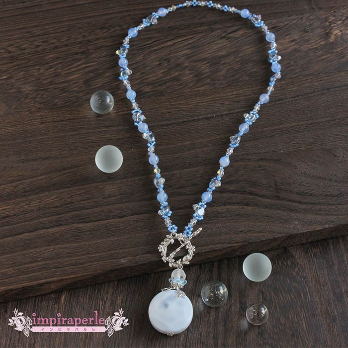 ブルーカルセドニーのコインをメインにして、雨の恵みを喜ぶイメージで大人可愛いネックレスに仕立てました。