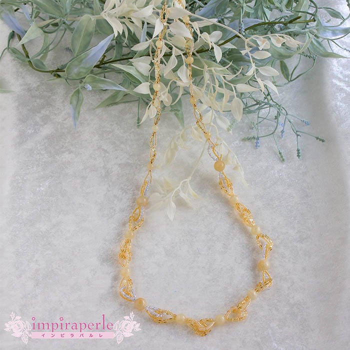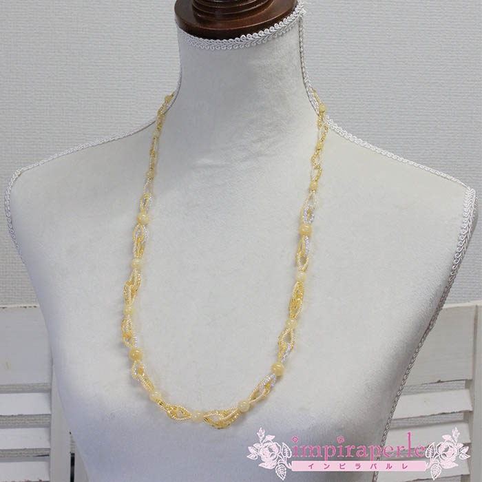 淡い蜂蜜イエローの天然石ハニージェイドと繊細なシードビーズを組み合わせたロングネックレス。