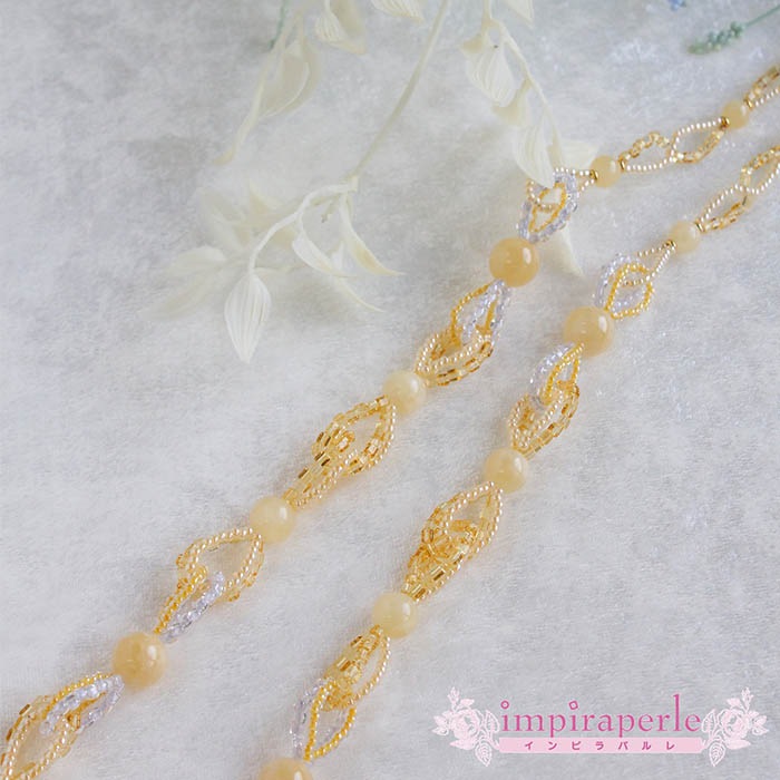 | 使用パーツ | ハニージェイド、三角ビーズ、シードビーズ、トライアングル、Demi712(本金メッキ)、テグス、ナイロンコートワイヤー、留め具など |