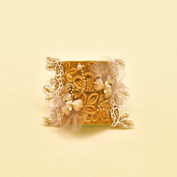 インド刺繍リボンのトパーズ色に合わせ色合いは茶・ゴールド・薄ピンク等で纏めました。