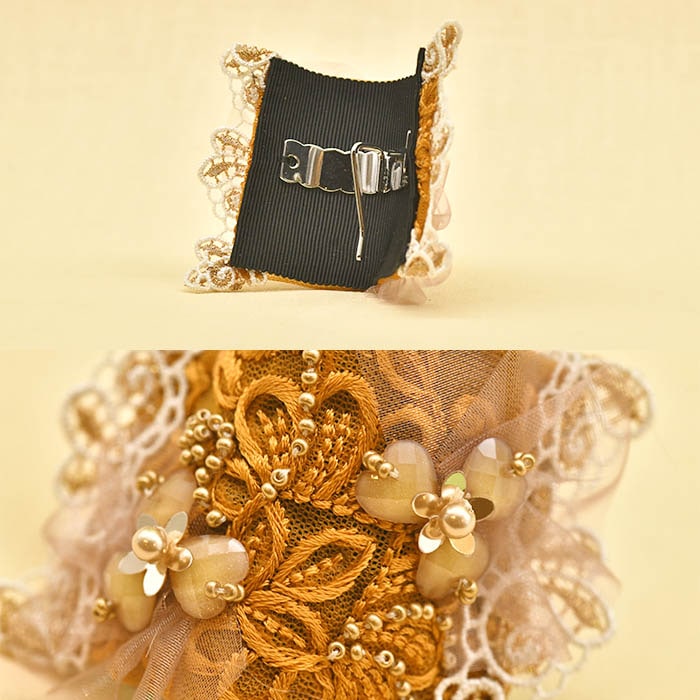 | 使用パーツ | インド刺繍リボン、レース、チュールリボン、花形スパングル、パール、貼り付けパーツ、特小ビーズ、グログランリボン、ポニーフック金具 |