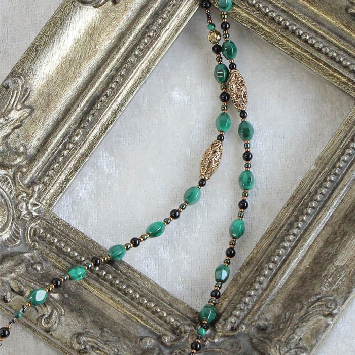 マラカイトの鮮やかなグリーンが装いを引き立てるロングネックレス。