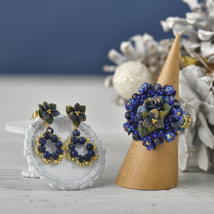 | 使用パーツ | NARUMIDOクレイフラワー、ラピスラズリ、樹脂パール、グラスビーズ、アイオライト、スパングル、テグス |