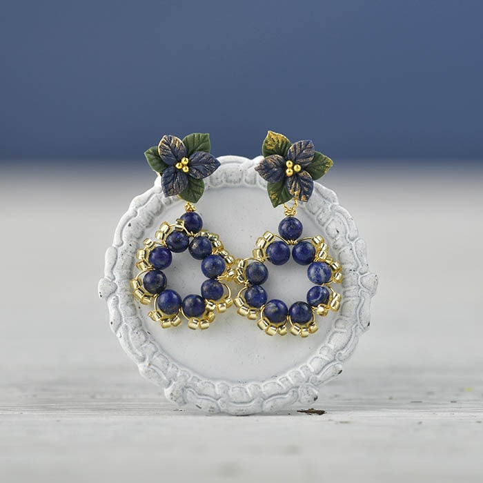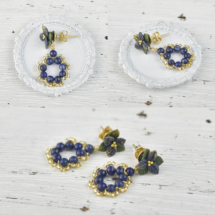 | 使用パーツ | NARUMIDOクレイフラワー、ラピスラズリ、グラスビーズ、ワイヤー、金具類 |
