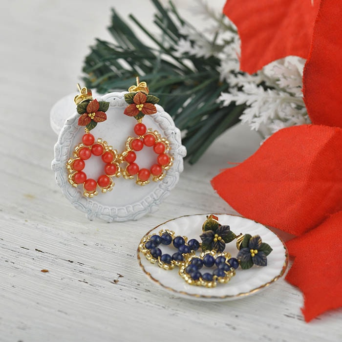 ポインセチアと天然石を使ってシンプルながらもゆらゆら眼をひくピアスorイヤリングにしました!