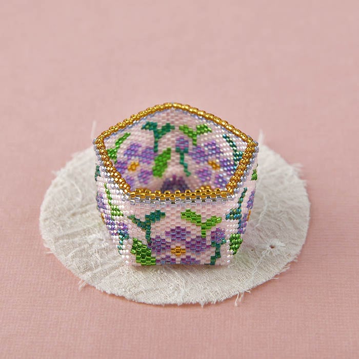 BOXの形は5角形。ペヨーテステッチで立体のBOXを編みます。