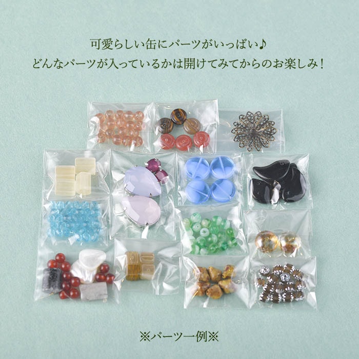 チェコビーズいろいろ10種以上、パーツ・金座など5種以上、天然石MIX、レース2種、アクリルパーツなど。 可愛らしい缶いっぱいに入ったお楽しみ袋です! カラフル、モダンなカラーがいろいろ入っていますので、何が届くかはお楽しみに! 開ける時のワクワク感はひとしおです!