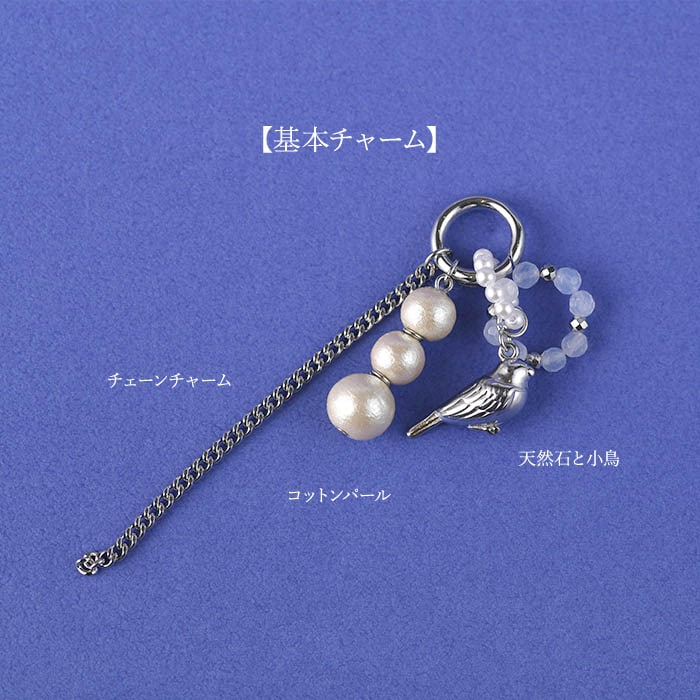 | 使用パーツ | ブルーカルセドニー、樹脂パール、コットンパール、シルバーメタルパーツ、アメジスト、クリスタル、オレンジムーンストーン、シェル、テグス |